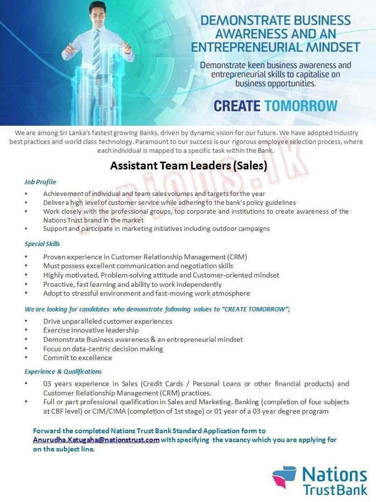 Job Title: Assistant Team Leaders – Nations Trust Bank PLC