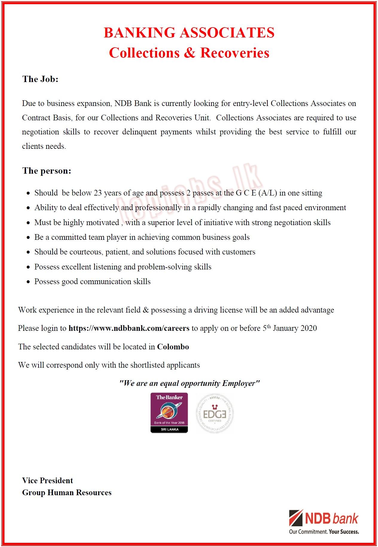 Job Title: Banking Associate – recoveries and collections – National Development Bank PLC