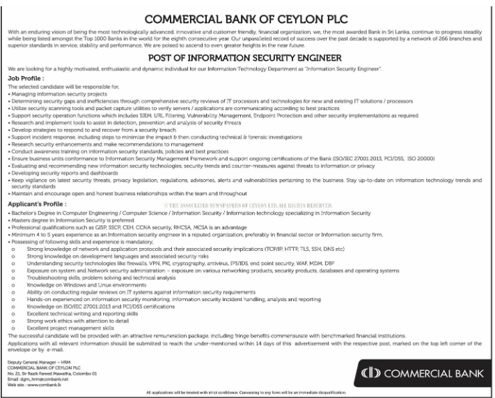 Information Security Engineer vacancies in commercial Bank Sri Lanka – Sri Lanka Private Banking Job Vacancies