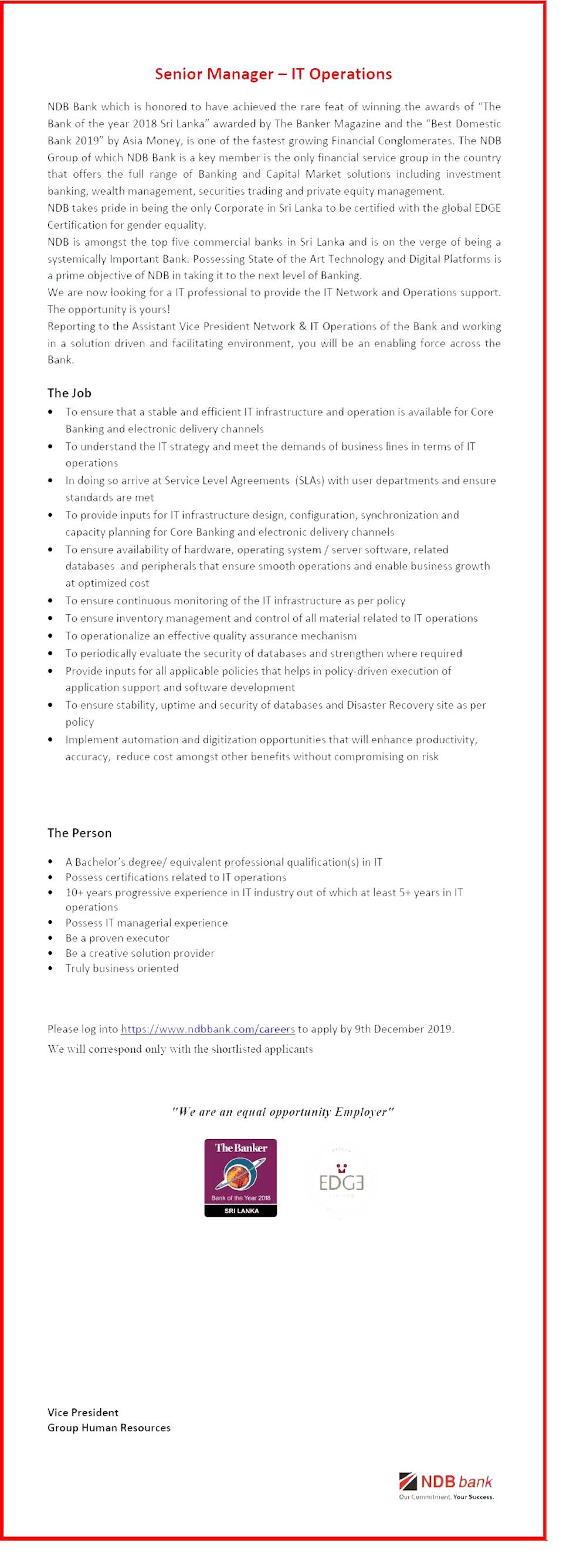 Job Title: Assistant Audit Manager – Information Security – National Development Bank PLC