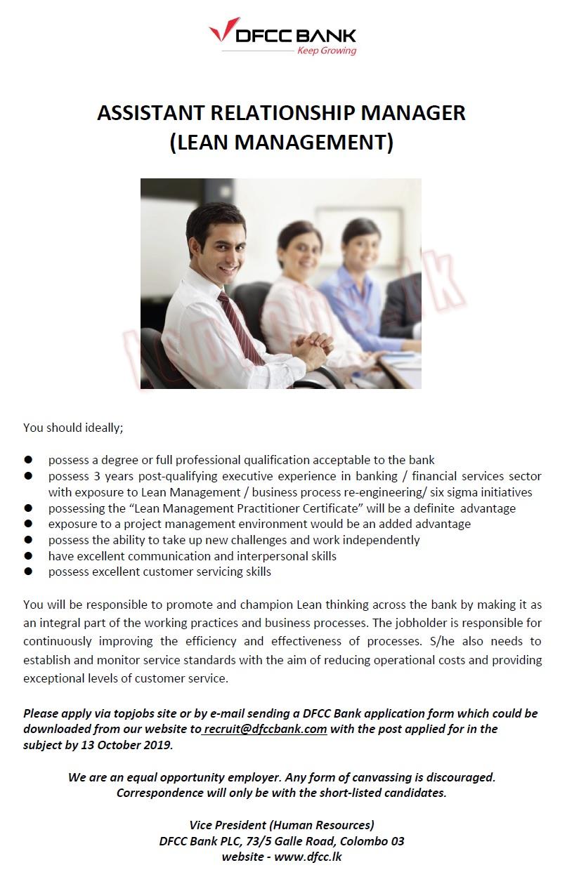Job Title: ASSISTANT RELATIONSHIP MANAGER (LEAN MANAGEMENT) -DFCC BANK
