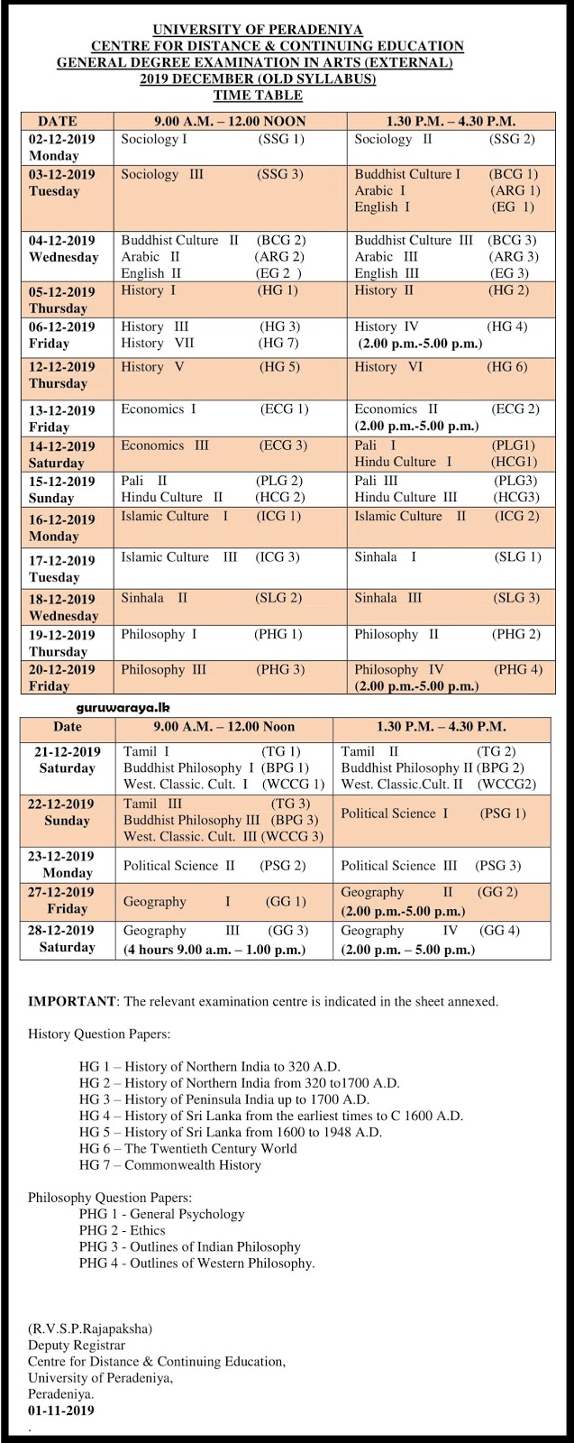 Centre for Distance & Continuing Education, University of Peradeniya has released the timetable of General Degree Examination in Arts (External – Old Syllabus) – December 2019.