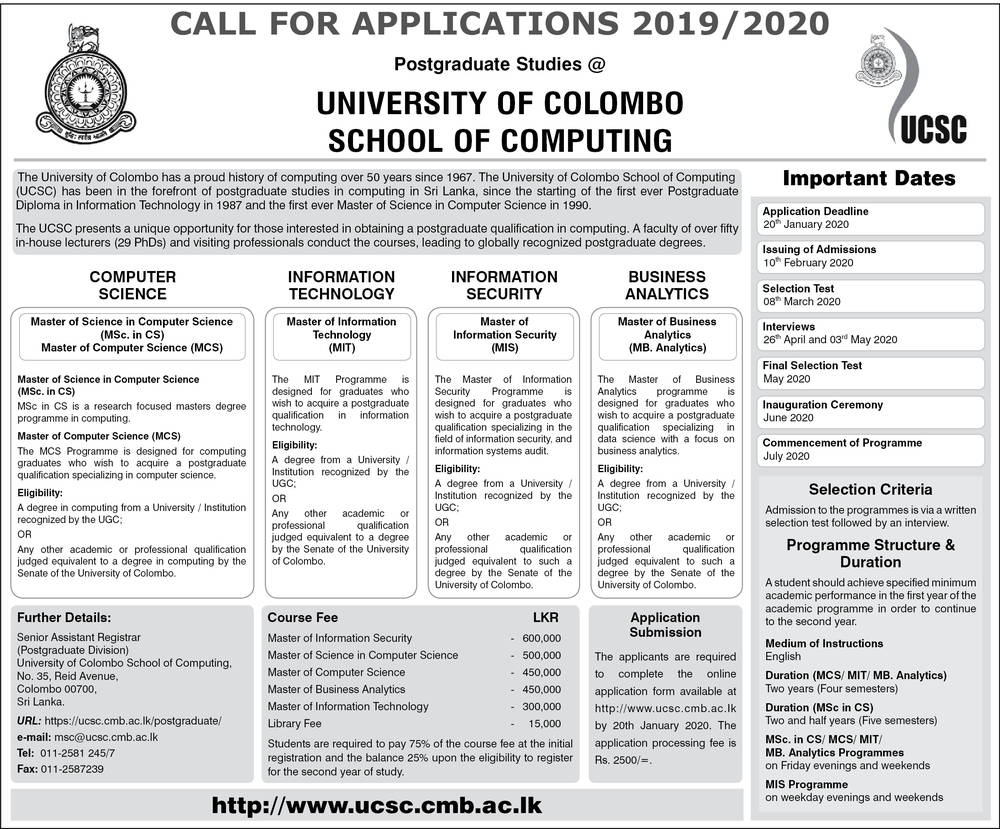 Courses (MCS in CS, MCS, MIT, MIS, MB Analytics) – University of Colombo