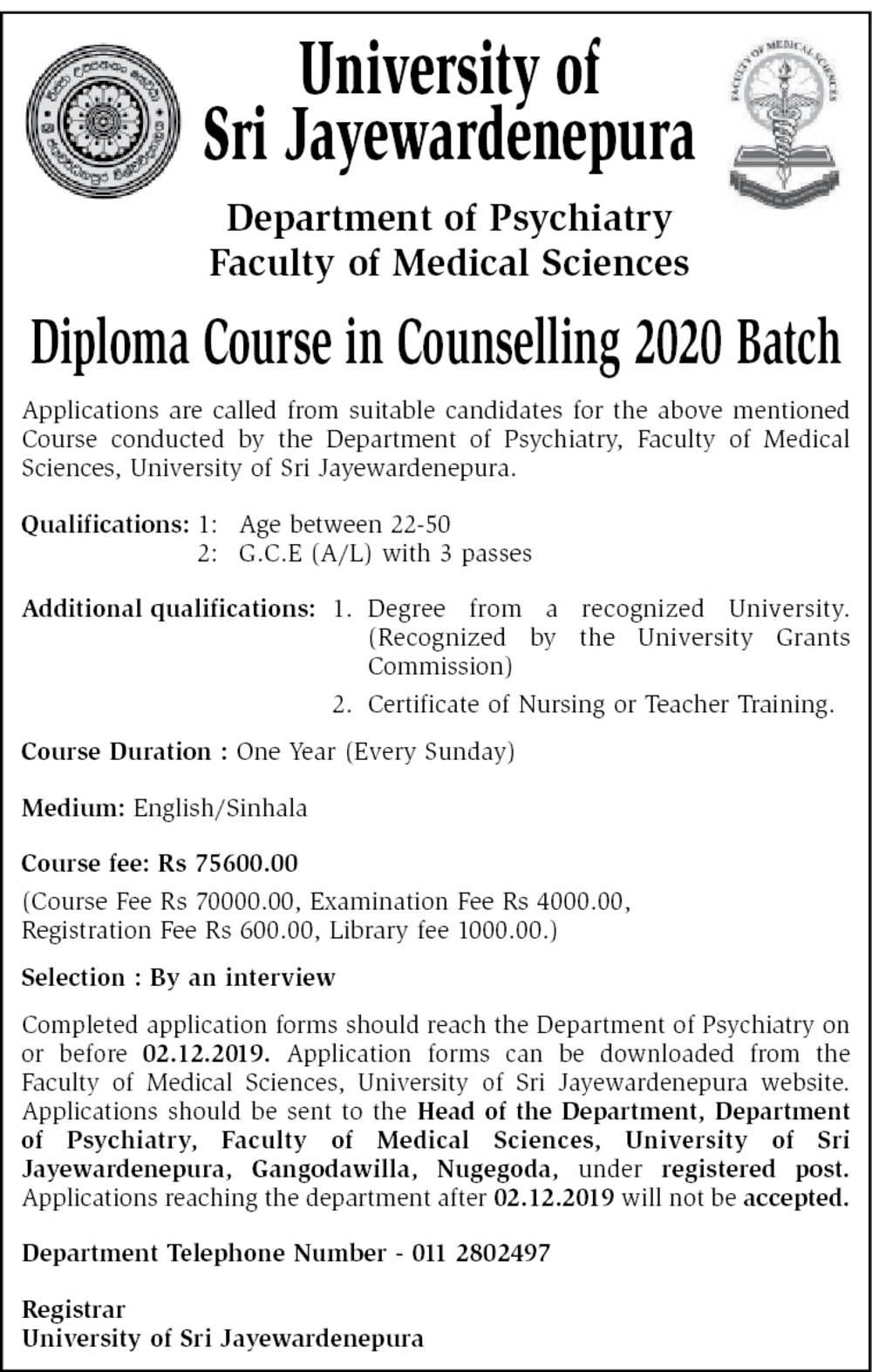 Course Title: Diploma Course in Counselling (2020) – Department of Psychiatry – University of Sri Jayewardenepura