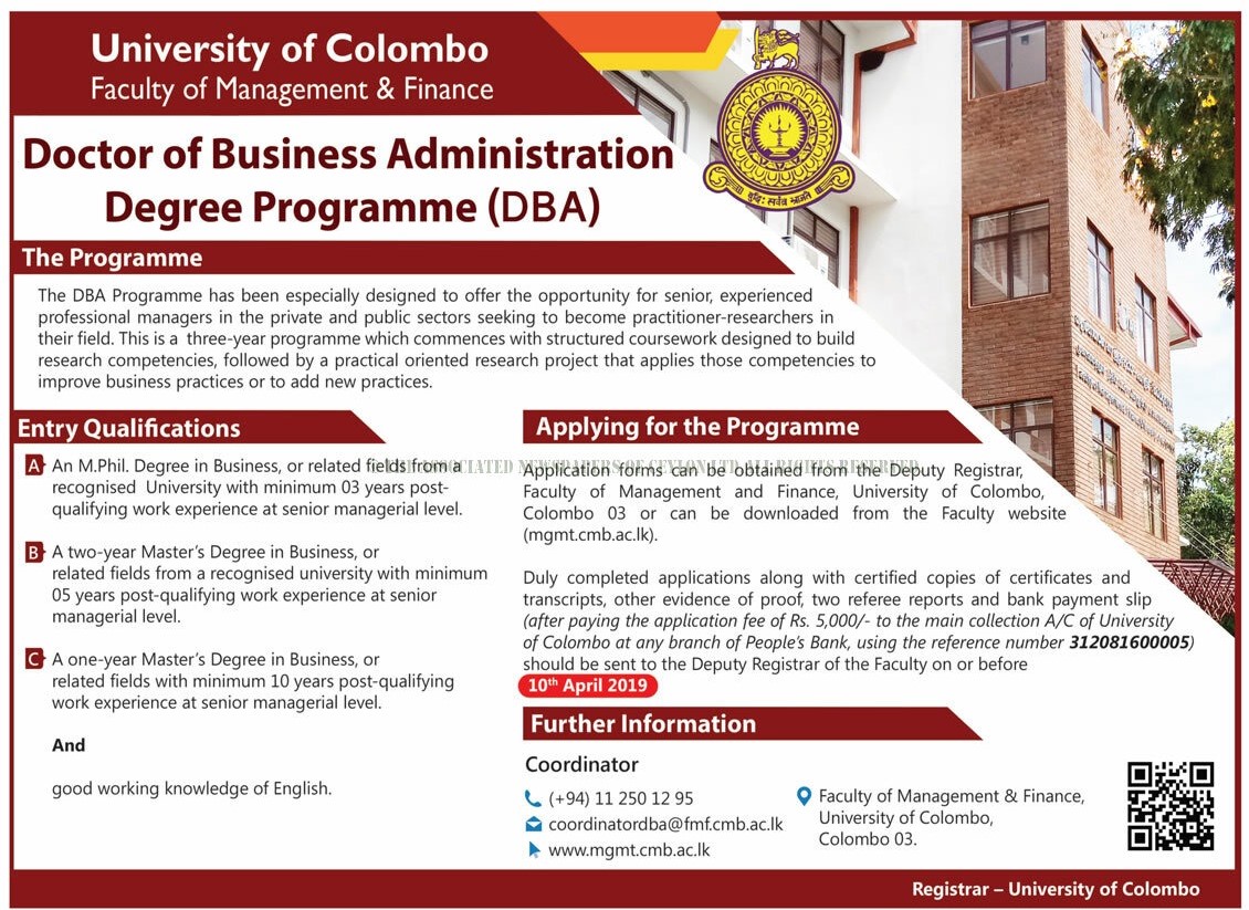 Doctor of Business Administration Degree Programme (DBA) – Faculty of Management & Finance – University of Colombo
