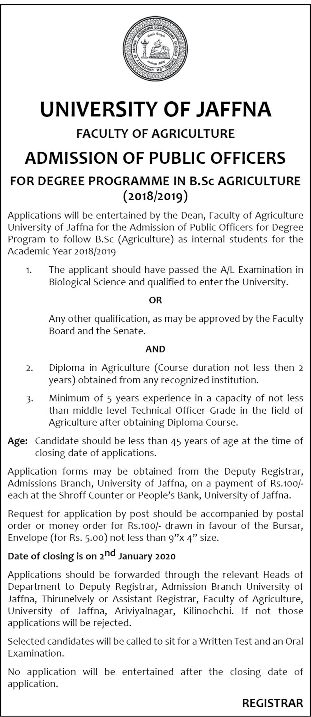 Degree Programme in B.Sc Agriculture: Faculty of Agriculture – University of Jaffna
