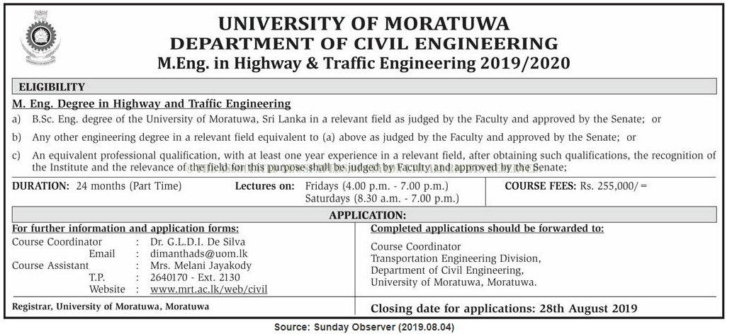 M.Eng. in Highway & Traffic Engineering 2019/2020 – University of Moratuwa