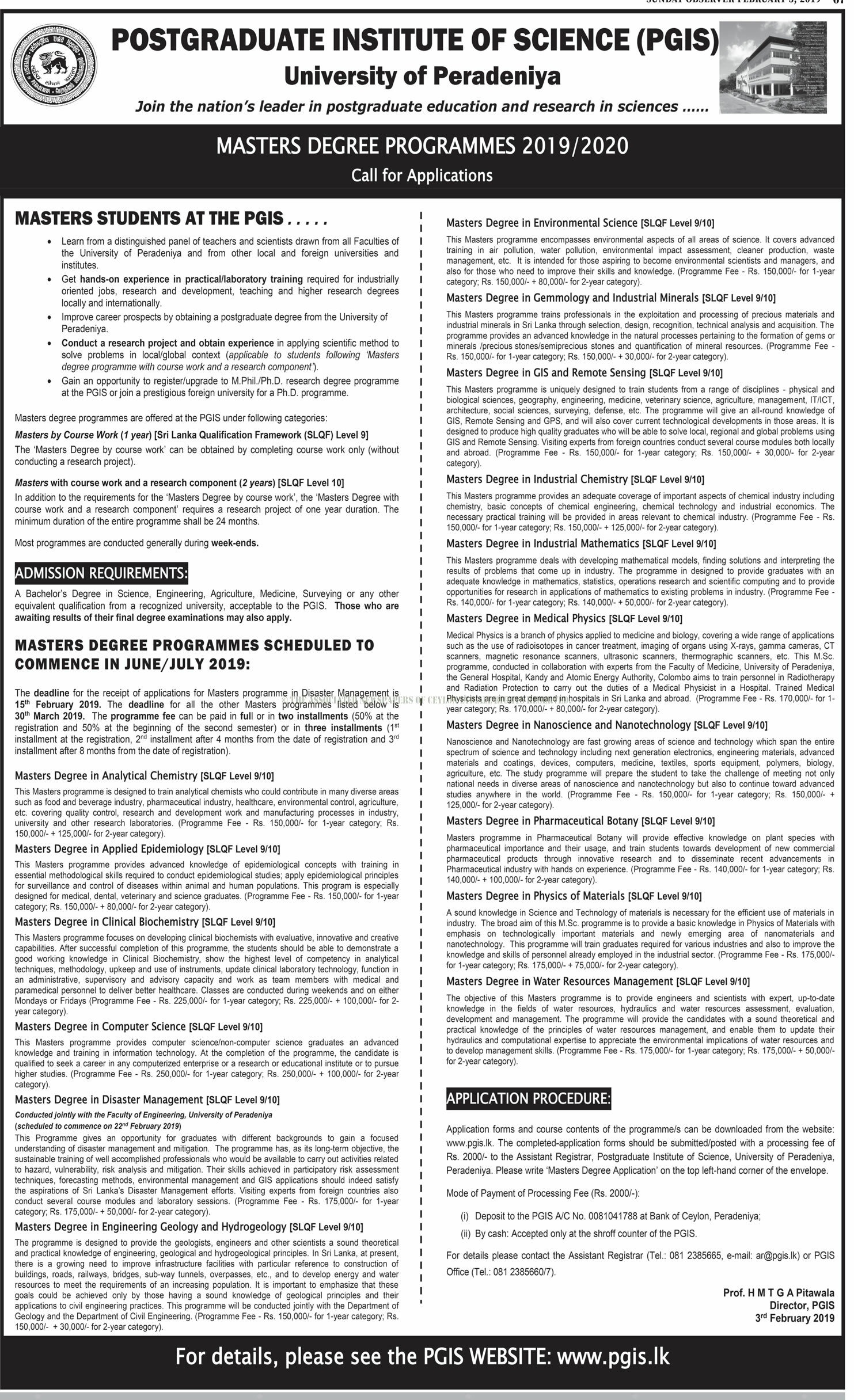 Master’s Degree Programmes 2019/2020 – Postgraduate Institute of Science – University of Peradeniya