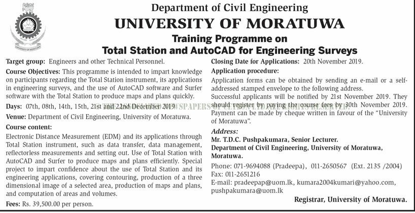 Training Programme on Total Station & AutoCAD for Engineering Surveys – University of Moratuwa