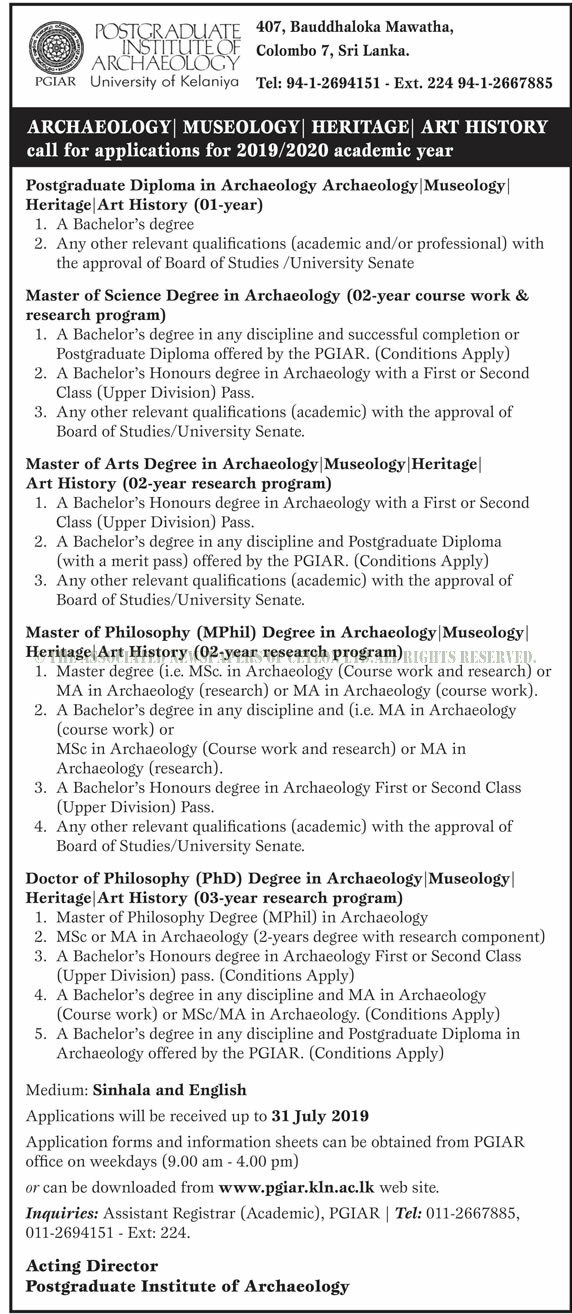 Archaeology/ Museology / Heritage / Art History – Postgraduate Institute of Archaeology – University of Kelaniya Government Courses