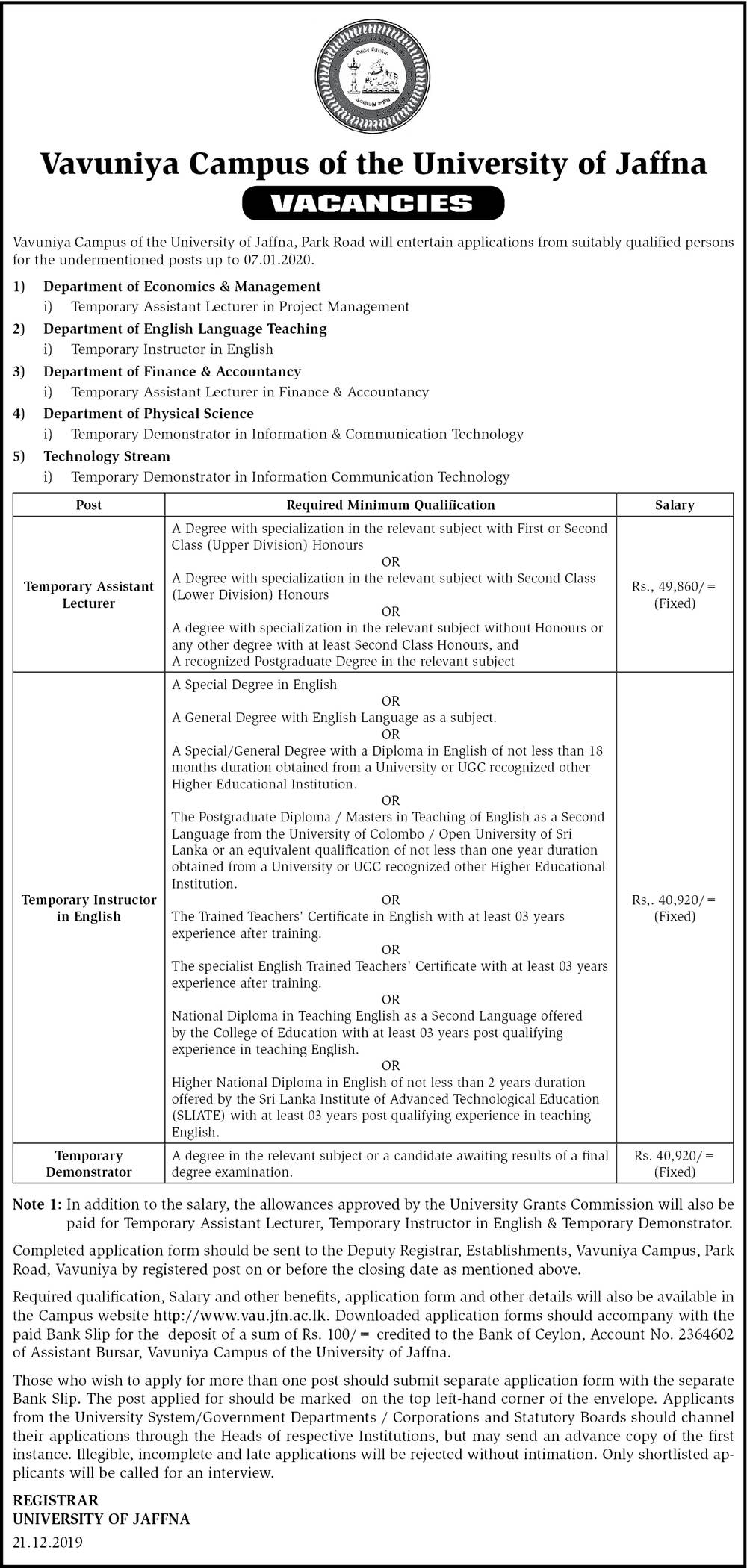 Assistant Lecturer, Instructor in English, Demonstrator – Vavunia Camus of the University of Jaffna