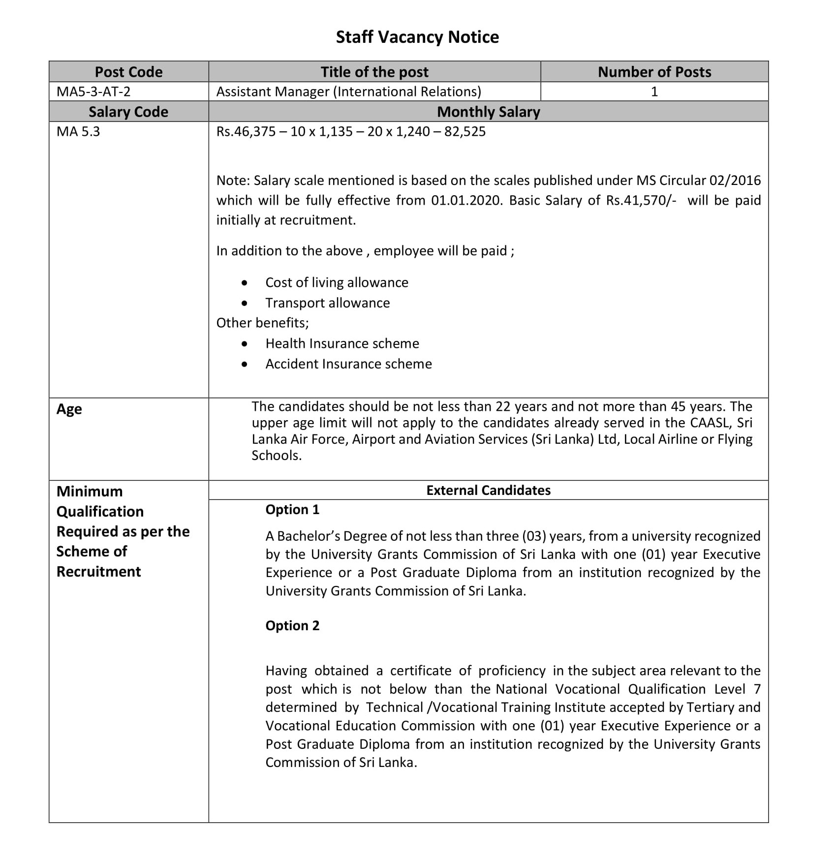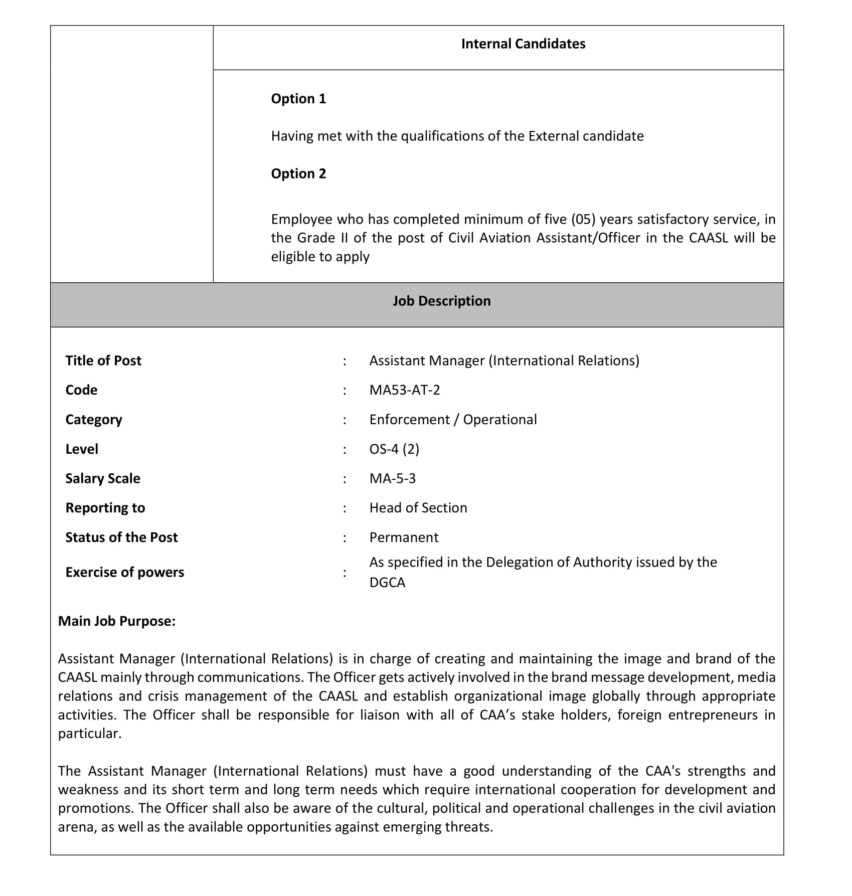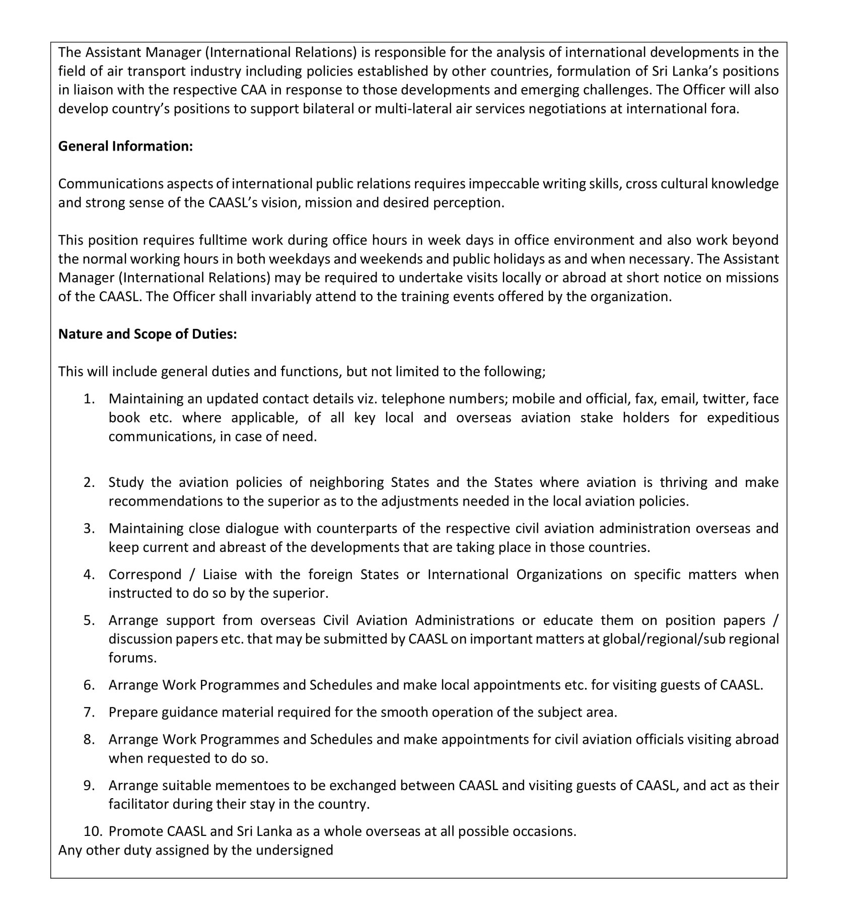 Assistant Manager (International Relations) – Civil Aviation Authority