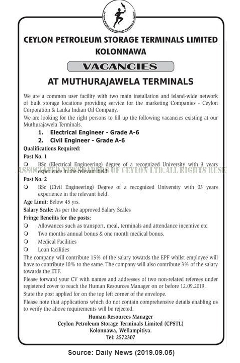 Job Title: Electrical Engineer, Civil Engineer – Ceylon Petroleum Storage Terminals Limited