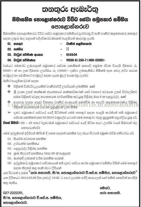 Commercial Manager – Polonnaruwa Multi Purpose Cooperative Society Ltd job vacncies in sri lanka 2019