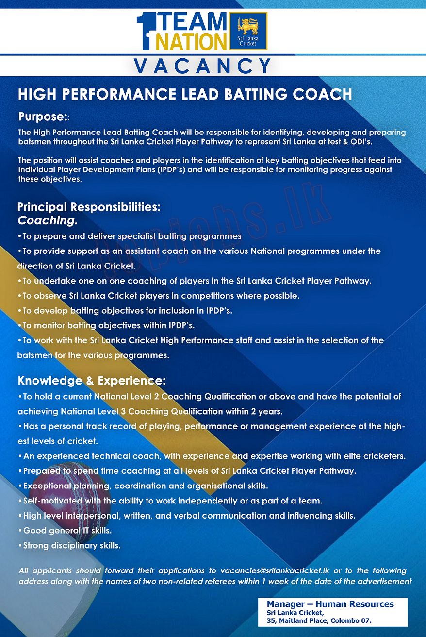 High Performance Lead Batting CoachJuly 24, 2018 Vacancies for High-Performance Lead Fast Bowling Coach | Physiotherapist | High-Performance Lead Batting Coach | Assistant Spin Bowling Coach Application Closing Date: 07-08-2018Share this: Click to share on Facebook (Opens in new window) Facebook Click to share on WhatsApp (Opens in new window) WhatsApp Click to share on Telegram (Opens in new window) Telegram Click to share on X (Opens in new window) X Click to share on LinkedIn (Opens in new window) LinkedIn More Click to email a link to a friend (Opens in new window) Email