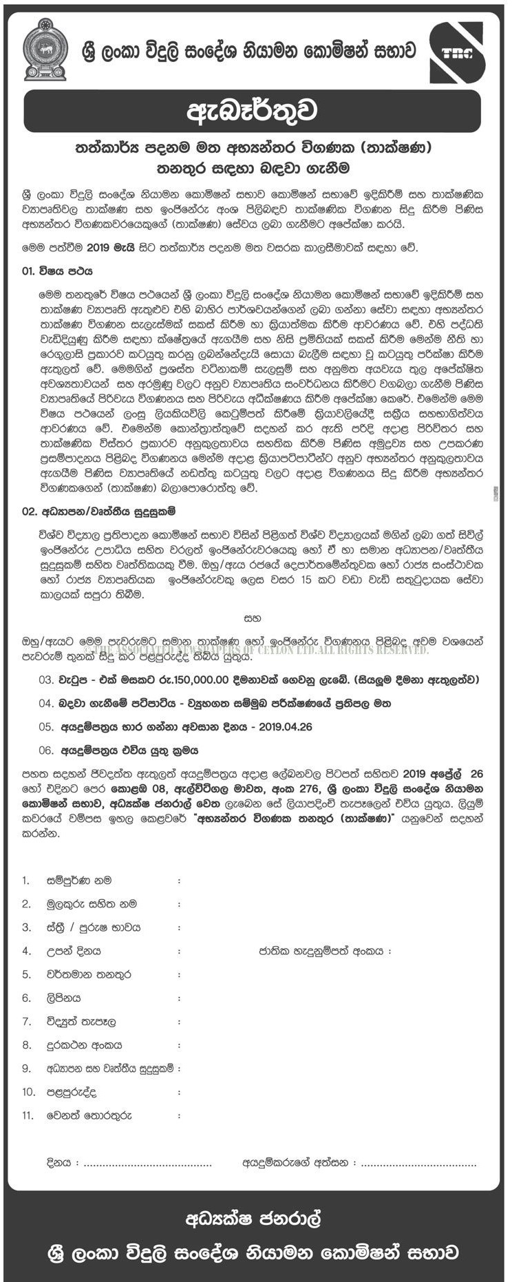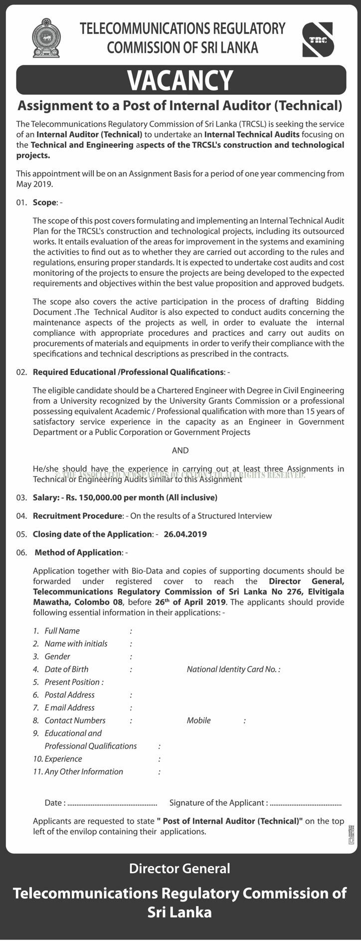 Internal Auditor (Technical) – Telecommunications Regulatory Commission of Sri Lanka