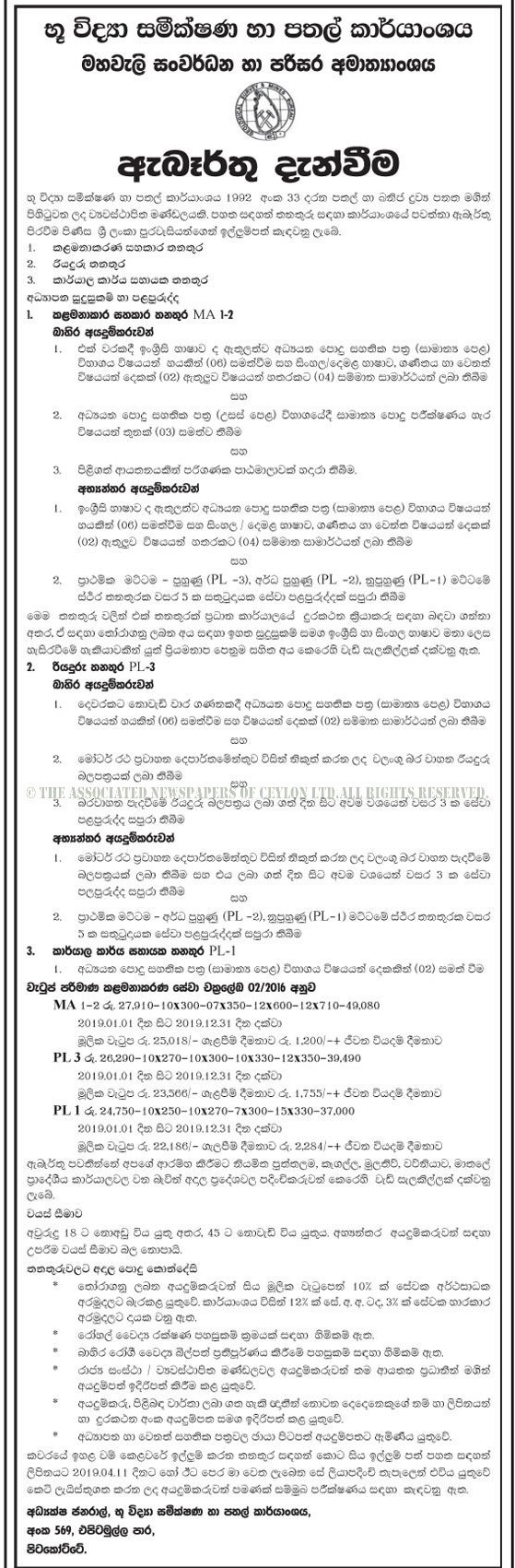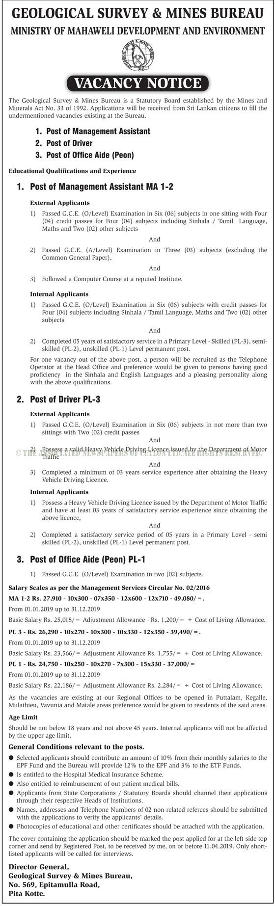 Management Assistant, Office Aide (Peon), Driver – Geological Survey & Mines Bureau