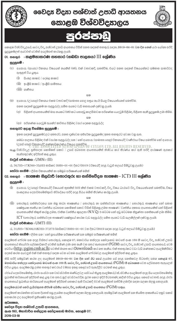 Source: Dinamina, Daily News (2019.03.18), Application Form: www.pgim.cmb.ac.lk (2019.03.18)