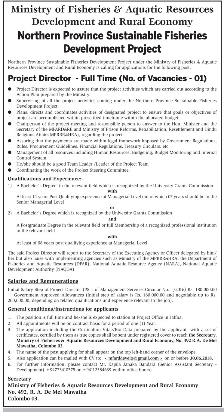 Ministry of Fisheries & Aquatic Resources – Development and Rural EconomyJune 16, 2018 Ministry of Fisheries & Aquatic Resources – Development and Rural EconomyJob Opportunities Share this: Click to share on Facebook (Opens in new window) Facebook Click to share on WhatsApp (Opens in new window) WhatsApp Click to share on Telegram (Opens in new window) Telegram Click to share on X (Opens in new window) X Click to share on LinkedIn (Opens in new window) LinkedIn More Click to email a link to a friend (Opens in new window) Email