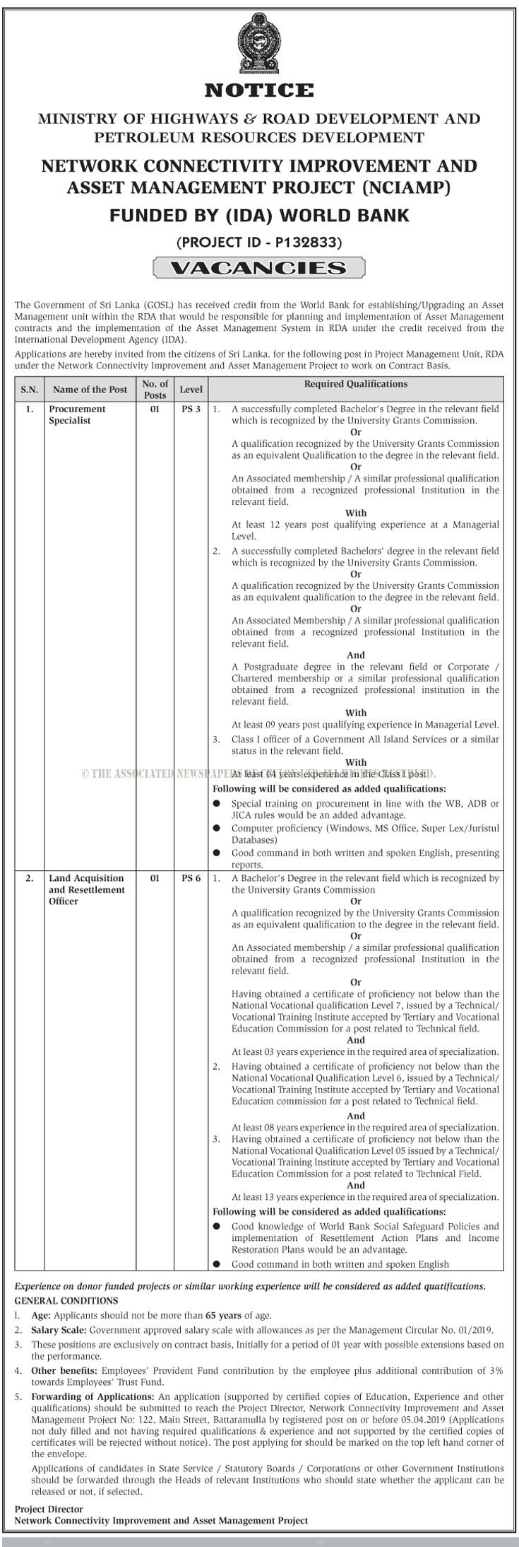 Procurement Specialist, Land Acquisition & Resettlement Officer – Ministry of Highways & Road Development and Petroleum Resources Development