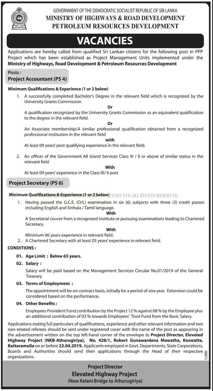 Project Accountant, Project Secretary – Ministry of Highways & Road Development Petroleum Resources Development