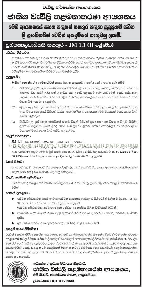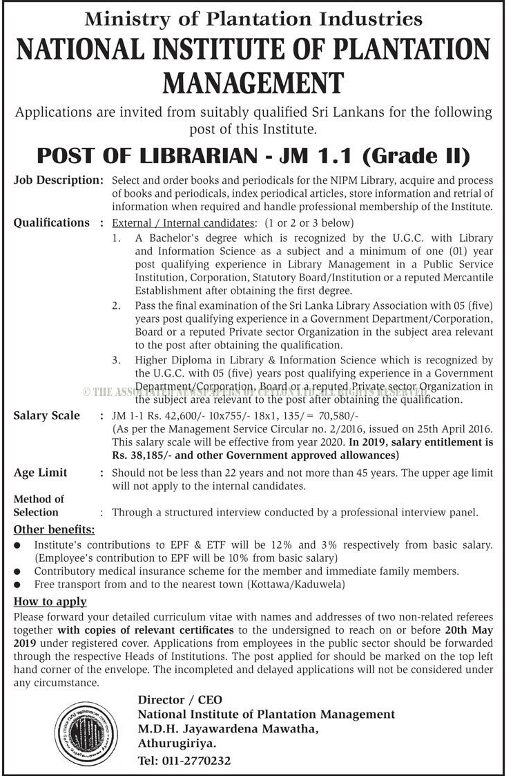 Government Librarian Vacancies –National Institute of Plantation Management Job Vacancies 2019 in Sri Lanka