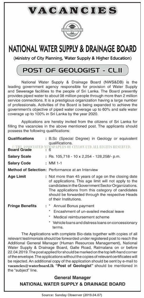 Geologist – National Water Supply & Drainage Board