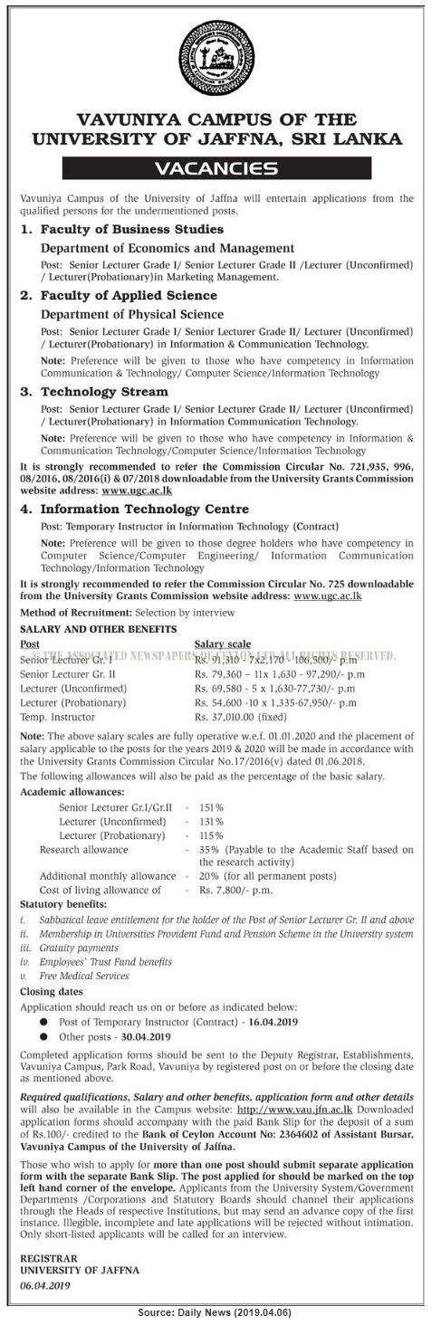 Senior Lecturer, Lecturer, Temporary Instructor – University of Jaffna