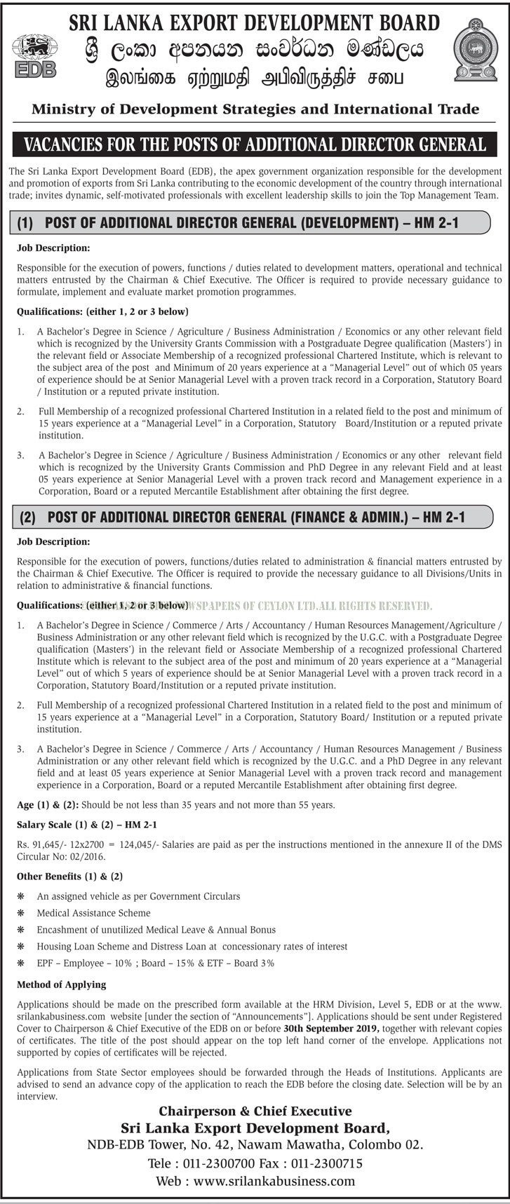 Additional Director General (Development, Finance & Admin) – Sri Lanka Export Development Board