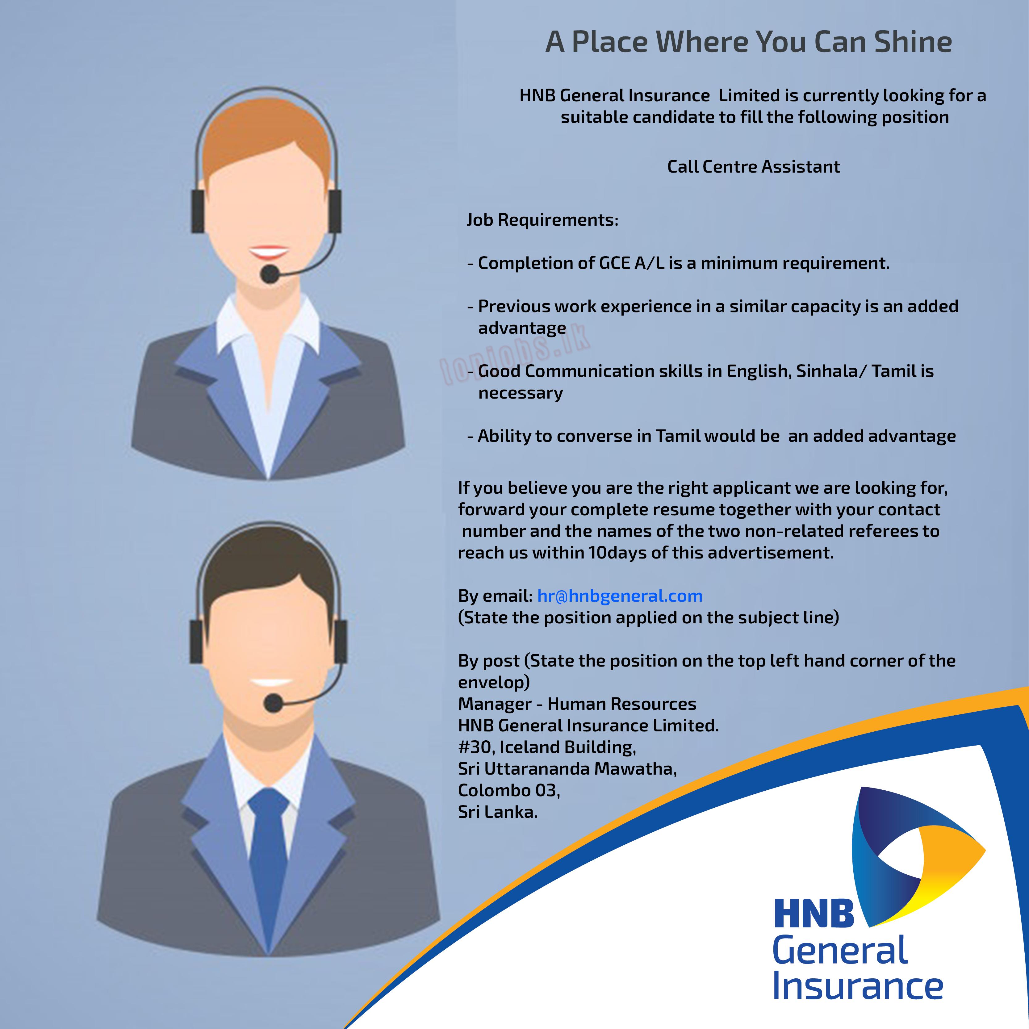Job Title: Call Center Assistant – HNB General Insurance Limited