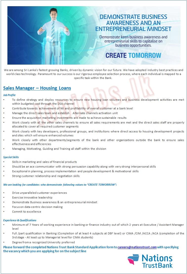 Job Title: Sales Manager – Housing Loans – Nations Trust Bank PLC