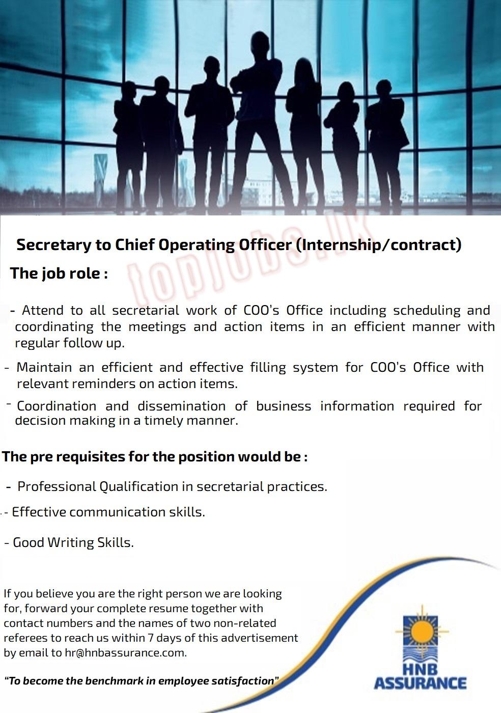 Job Title: Secretary to Chief Operating Officer (Internship/contract) – HNB Assurance PLC