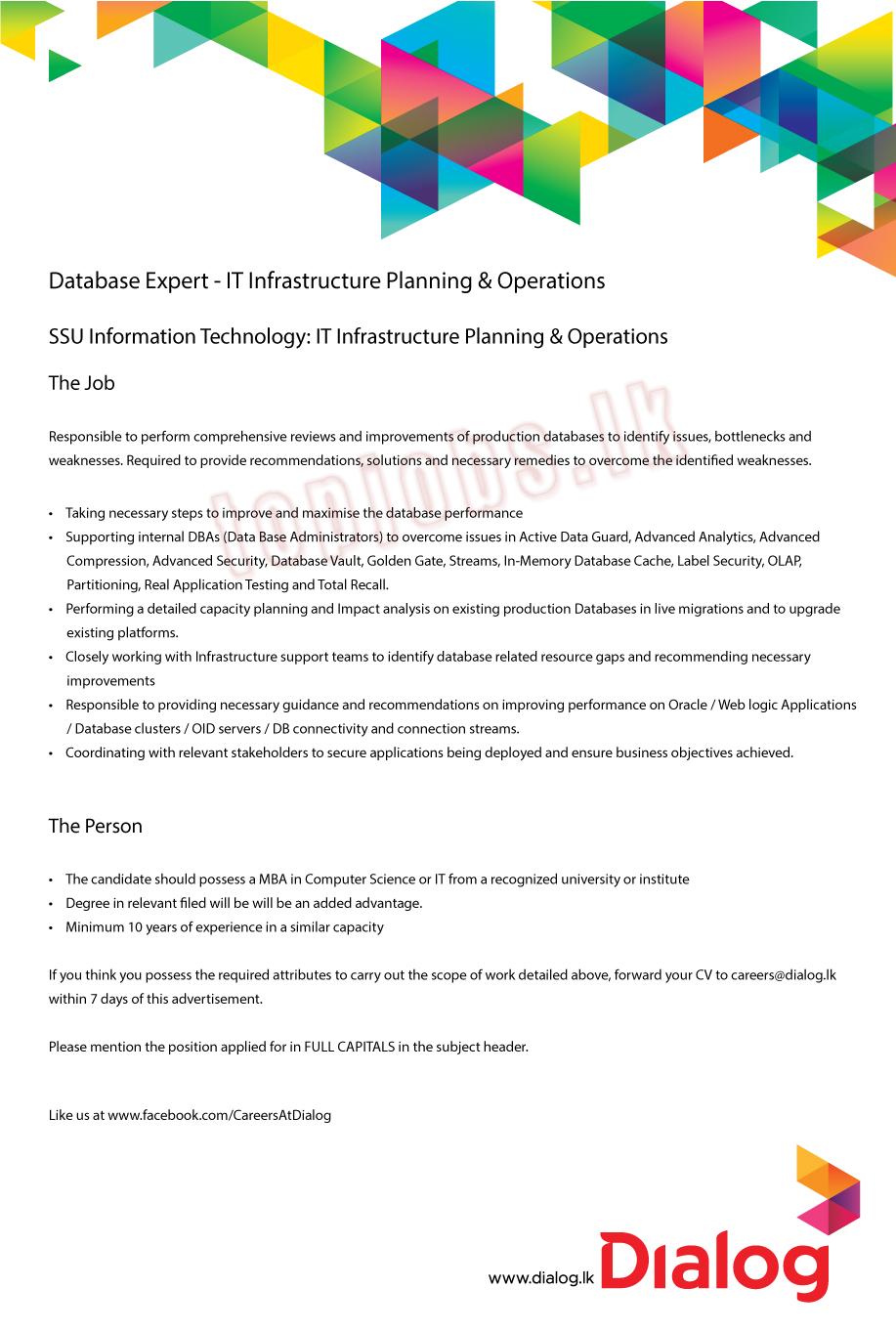 If you think you possess the required attributes to carry out the scope of work detailed above, forward your CV to careers@dialog.lk within 7 days of this advertisement.