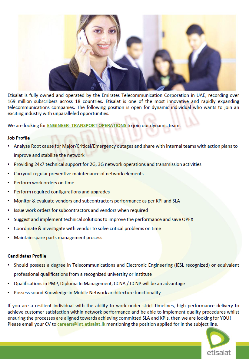 Vacancies in Etisalat Lanka (Pvt) LtdJune 5, 2018 Vacancies in Etisalat Lanka (Pvt) Ltd We are looking for Engineer – Transport Operations to join our dynamic team.Closing Date: 12-06-2018Source: Topjobs.lk Share this: Click to share on Facebook (Opens in new window) Facebook Click to share on WhatsApp (Opens in new window) WhatsApp Click to share on Telegram (Opens in new window) Telegram Click to share on X (Opens in new window) X Click to share on LinkedIn (Opens in new window) LinkedIn More Click to email a link to a friend (Opens in new window) Email