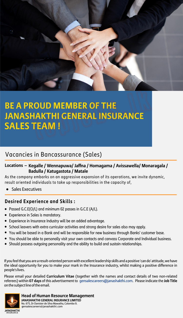 Vacancies in Janashakthi – Bancassurance (Sales)July 26, 2018 Vacancies in Janashakthi – Bancassurance (Sales) Vacancies in Janashakthi – Bancassurance (Sales)Closing Date : 03.08.2018Source : topjobs.lkShare this: Click to share on Facebook (Opens in new window) Facebook Click to share on WhatsApp (Opens in new window) WhatsApp Click to share on Telegram (Opens in new window) Telegram Click to share on X (Opens in new window) X Click to share on LinkedIn (Opens in new window) LinkedIn More Click to email a link to a friend (Opens in new window) Email