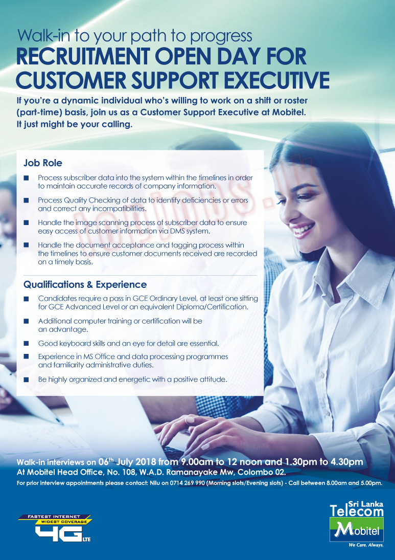 Vacancies in Mobitel (Pvt) LtdJuly 5, 2018 Vacancies in Mobitel (Pvt) LtdVacancies for Customer Support ExecutiveClosing Date: 06-07-2018Source: Topjobs.lkShare this: Click to share on Facebook (Opens in new window) Facebook Click to share on WhatsApp (Opens in new window) WhatsApp Click to share on Telegram (Opens in new window) Telegram Click to share on X (Opens in new window) X Click to share on LinkedIn (Opens in new window) LinkedIn More Click to email a link to a friend (Opens in new window) Email